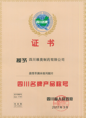 米兰在线注册医药”奥恬苹牌米格列醇片”,被四川省人民政府办公厅川办函(2017)16号授予“四川名牌产品”称号